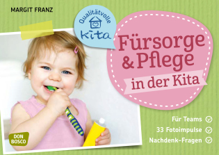 Mit den Bildkarten im handlichen Postkartenformat können pädagogische Fachkräfte die Qualität ihrer eigenen Pädagogik dialogisch überprüfen und weiterentwickeln. Auf der Vorderseite ist ein Foto zu sehen und auf der Rück-seite sind Impulsfragen auf unterschiedlichen Qualitätsebenen (Orientierungs-, Struktur- und Prozessqualität) zu lesen, beispielsweise: